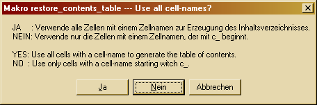 Mit dem Makro restore_contents_table können Sie ein Inhaltsverzeichnis wiederherstellen. Dies funktioniert nur, wenn Sie den Zellen einen Zellnamenzugewiesen hatten, d.h. Sie hatten für ADD_NAME_FOR_THE_CELL den Wert 3 oder 4 oder 5 verwendet, oder selbst einen Namen dafür definiert. Nach dem Start erscheint zunächst folgende Abfrage: