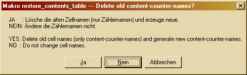 Wenn Sie Ja anklicken, werden alle existierenden Zählernamen (aber nicht die Inhaltsnamen oder anderen Namen) gelöscht und durch neue ersetzt. Wenn die alten Zählernamen irgendwie verwendet wurden (z.B. in Formeln oder Verweisen), so entstehen dadurch ungültige Bezüge. Sinnvoll ist Ja nur, wenn Sie die Namen nur in einem Inhaltsverzeichnis verwendet hatten, das Sie vor dem Aufruf des Makros löschen. Dann erhält man hinterher eine neue lückenlose Numerierung. Aus diesem Grund funktioniert hier die Dublettenvermeidung mit AVOID_DOUBLETS = 1 nicht, weil die alten Verweise auf die jeweiligen Zellen ja gar nicht mehr gültig wären. Deshalb ist diese Funktion nur beim Erstellen eines ganz neuen Verzeichnisses sinnvoll.