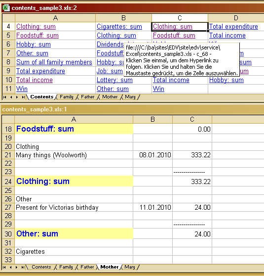 Bei Excel hingegen sind die Daten (Texte und Zahlen) in Zellen enthalten, die von oben nach unten, aber auch von links nach rechts organisiert sind. Außerdem gibt es in Excel-Dateien oft auch noch verschiedene Arbeitsblätter. Daraus ein Inhaltsverzeichnis zu erstellen, war für die Microsoft-Programmierer anscheinend zu schwierig. Um diesen Nachteil zu kompensieren, habe ich dieses Makro geschrieben, mit dem man Inhaltsverzeichnisse erstellen kann, die so aussehen: