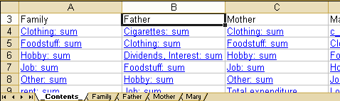 Die Datei ist ein einfaches Kassenbuch für eine Familie, die ihre Einnahmen und Ausgaben buchführen möchte. Für jedes Familienmitglied und für die Familie als Ganzes gibt es ein eigenes Arbeitsblatt. Das Inhaltsverzeichnis wird so erstellt (diese Einstellungen lassen sich anpassen, siehe unten):