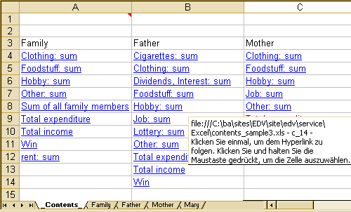 Natürlich können Sie das Inhaltsverzeichnis ausdrucken. Die wichtigste Funktion dürfte aber sein, daß sie sehr schnell zu einer bestimmten Stelle in der Datei springen können, indem Sie einen Eintrag anklicken. Wenn Sie große Dateien mit vielen Arbeitsblättern und vielen Zeilen und Spalten haben, können Sie sich damit viel Scroll-Arbeit ersparen.
